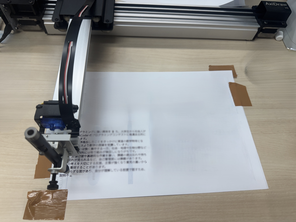 Axi Draw V3は紙をセットする場所がないためテーブルにガムテープで固定して調整したが、正直紙を正しい位置に固定する機能はついていた方がいいと思う。
